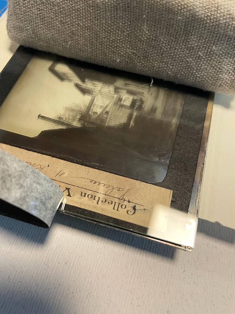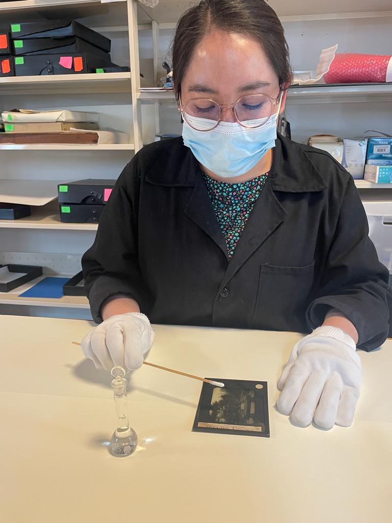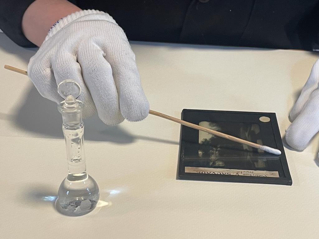 Las placas se conforman por tres estratos: 1) soporte de vidrio con la emulsión de plata/gelatina (imagen), 2) montura/pie de fotografía en cartón delgado y papel, respectivamente, y, por último, 3) el vidrio de protección. Por lo tanto, los diferentes estratos tuvieron que ser separados para realizar una limpieza superficial, eliminar el polvo depositado sobre la delgada imagen y evitar daños por abrasión.