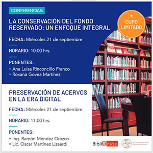 Invitación a las conferencias: “La conservación del fondo reservado: un enfoque integral” y “Preservación de acervos en la era digital” Se realizarán el miércoles 21 de septiembre a partir de las 10:00 hrs. Con la particiáción de Ana Luisa Rinconcillo Franco, Roxana Govea Martínez, Ramón Mendez Orozco, Oscar Martínez Lizaardi.