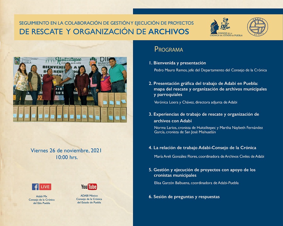 Adabi y el Consejo de la Crónica del Estado de Puebla invitan a la charla “Seguimiento en la colaboración de gestión y ejecución de proyectos de rescate y organización de archivos”
